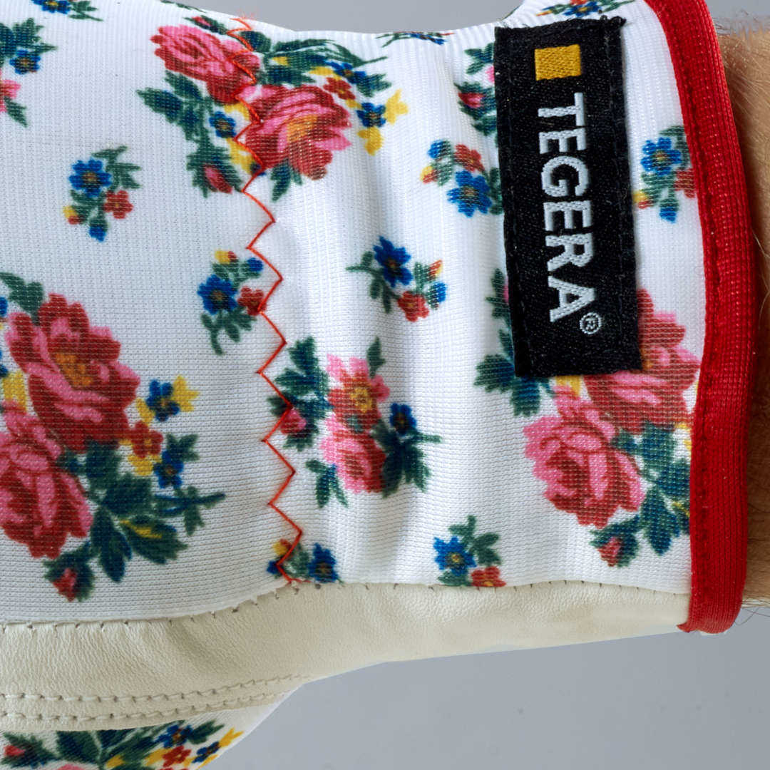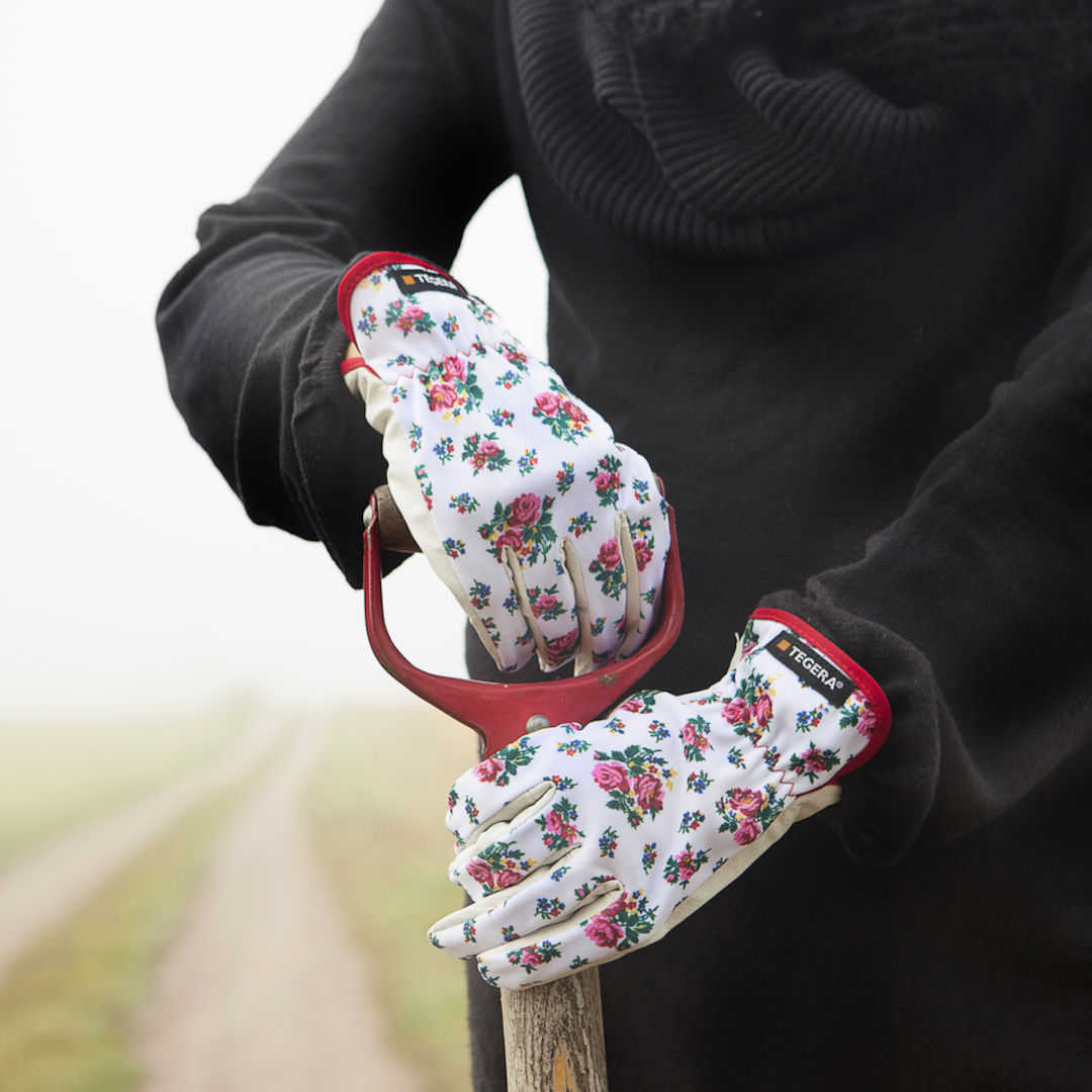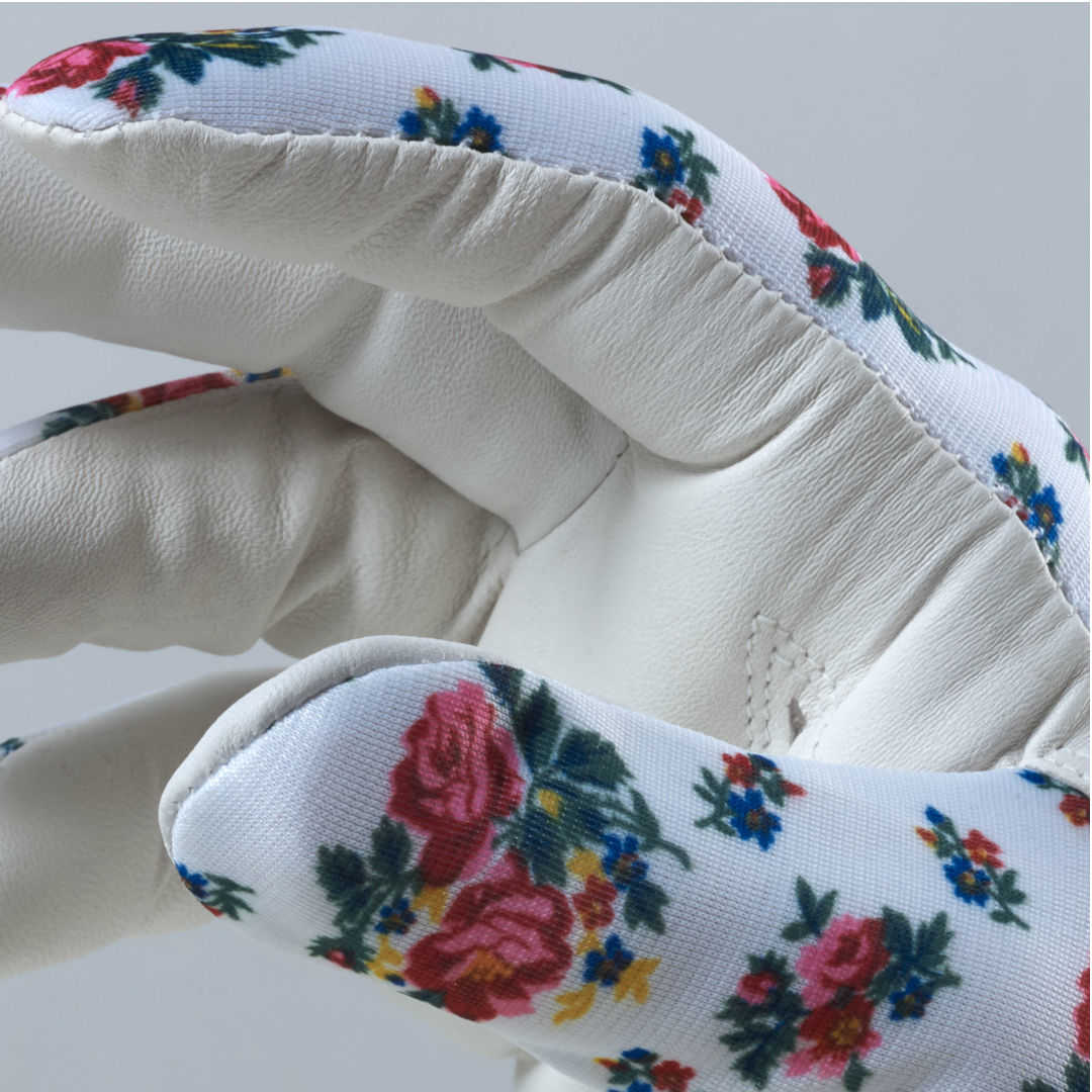 Gartenhandschuhe für Damen aus geschmeidigen Ziegenleder der Handrücken ist aus Nylon mit Blumenmuster.