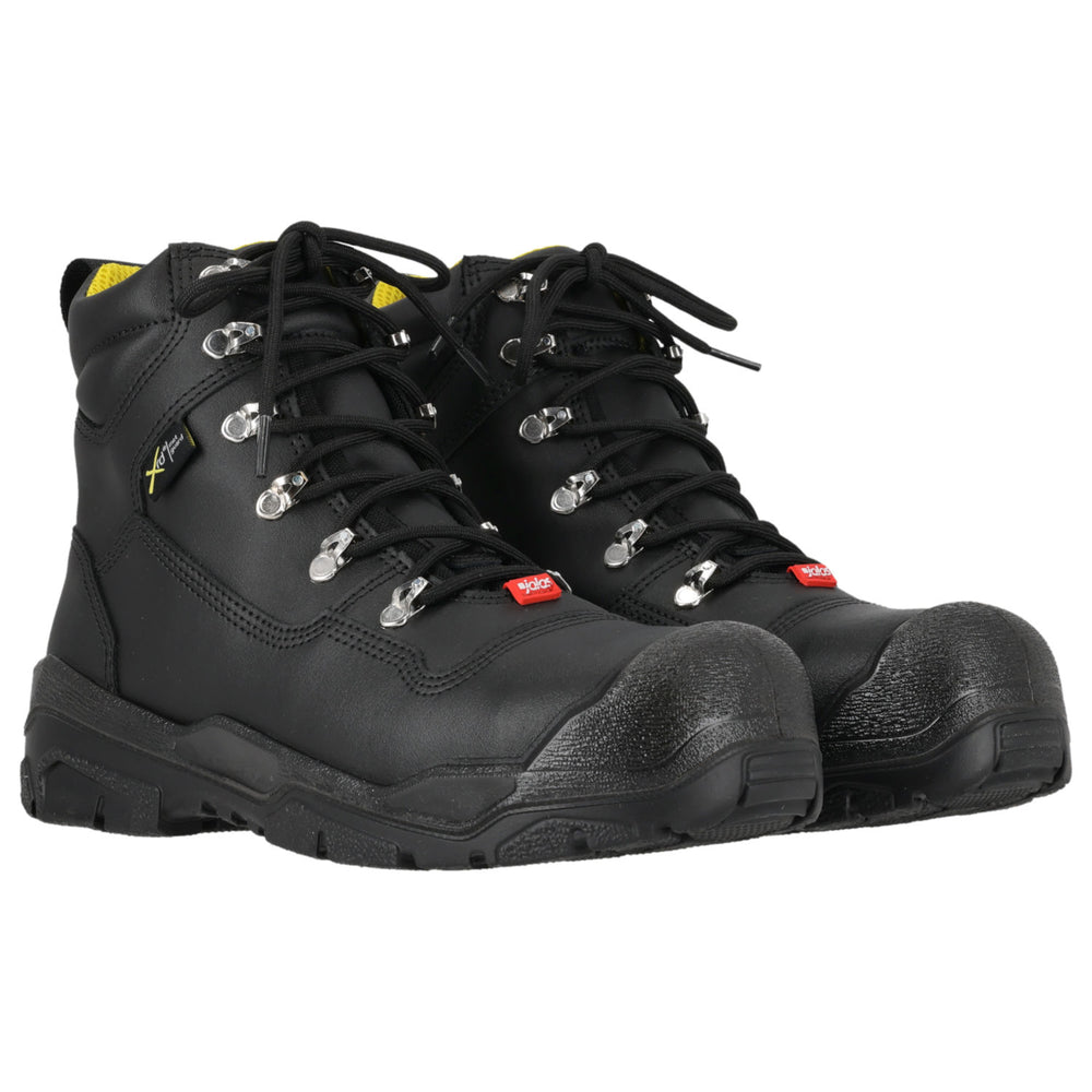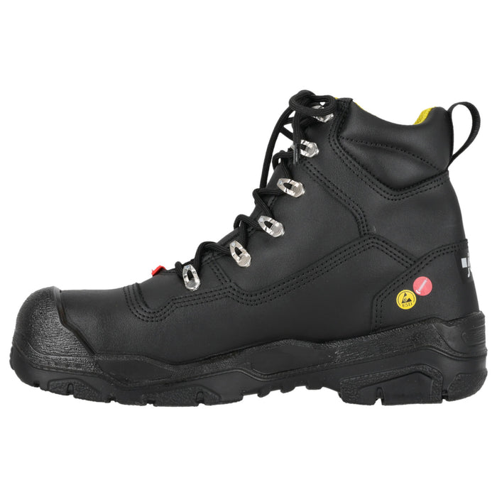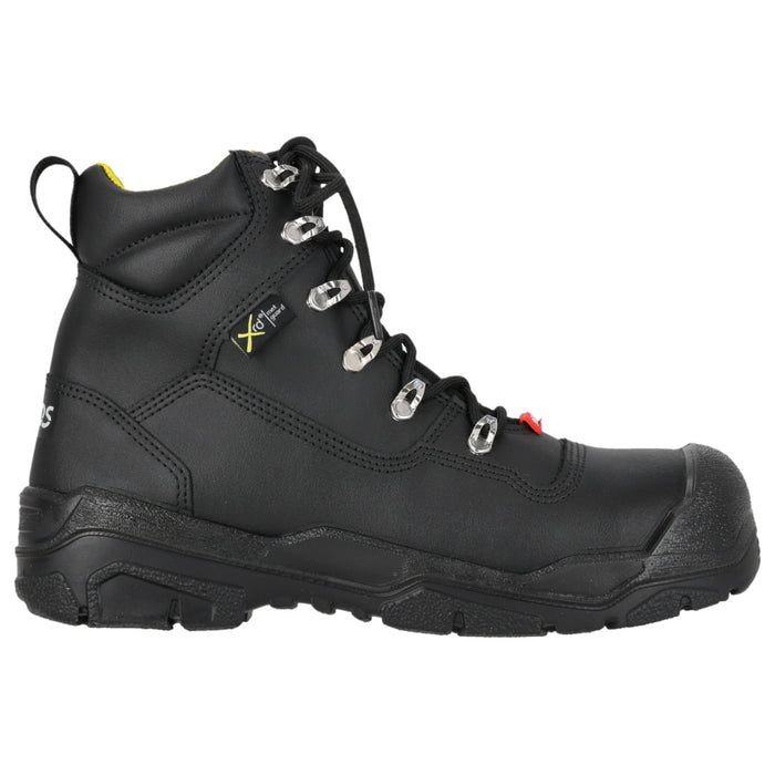 Ein neuer Stiefel mit integriertem XRD M-Guard Aufprallschutz für den Mittelfußschutz. Dieses Hightech- Material ist unter normalen Bedingungen weich und flexibel, verhärtet sich aber beim Aufprall und absorbiert bis zu 90 % der Aufprallenergie. Diese Funktion ist in anspruchsvollen Umgebungen besonders wichtig, um das Risiko von Verletzungen am oberen Fuß zu verringern. Die geräumigere Passform sorgt für extra Komfort. Mit Zehenkappe und Nageldurchtrittschutz.